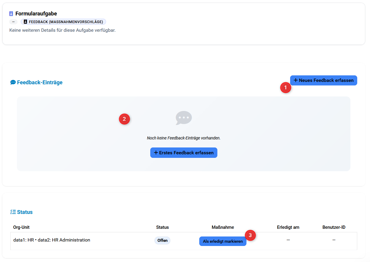 1. Hinterlegte Organisationseinheit. Bei kooperativen Aufgaben steht hier „Alle Teilnehmenden“ (siehe Sichtbarkeit).